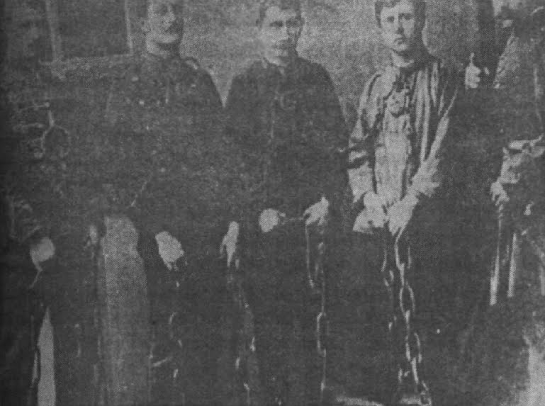 Заточени въстаници от с. Баня – поп Гурко, даскал Никола Барбалов, Тодор Даскала, Петко Белоконски и Н. Калоянов. Фотография от турските архиви (по Йонков)