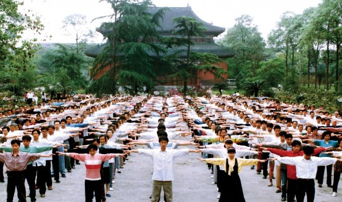 Последователи на Фалун Гонг правят упражнения в град Ченгду на китайската провинция Съчуан преди началото на преследването през 1999 г. Снимка: minghui.org