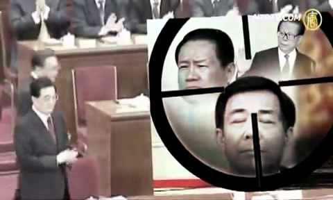 | Лидерът на Китай Ху Джинтао (долу в ляво) взема на прицел “Фракцията с окървавените ръце” – служителите, повишени от бившия лидер Джянг Земин (горе в дясно) за осъществяване на преследването на Фалун Гонг: Джоу Йонгканг (горе в ляво), Бо Шилай (долу в дясно). (NTDTV) |