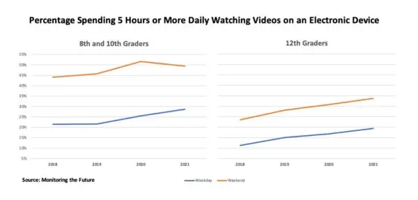 Около половины старшеклассников тратят на просмотр видео на электронных устройствах пять и более часов в день по выходным, а 30% — семь и более часов в день по выходным, согласно данным за 2021 год, собранным проектом Monitoring the Future (MtF), связанным с Национальным институтом здоровья.